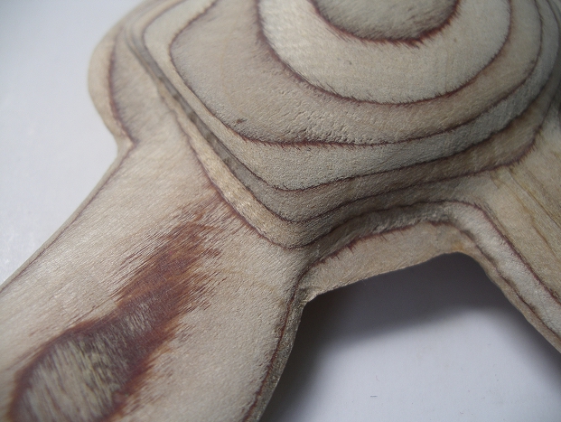 Mit Rhino 4.0 in 3D modelliert, mit einer 3-Achs Fräse zweiseitig aus einem Brettschichtholzblock gefräst.
